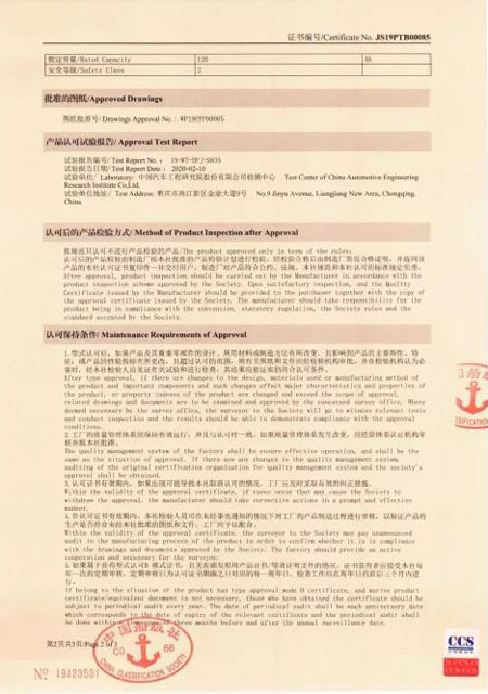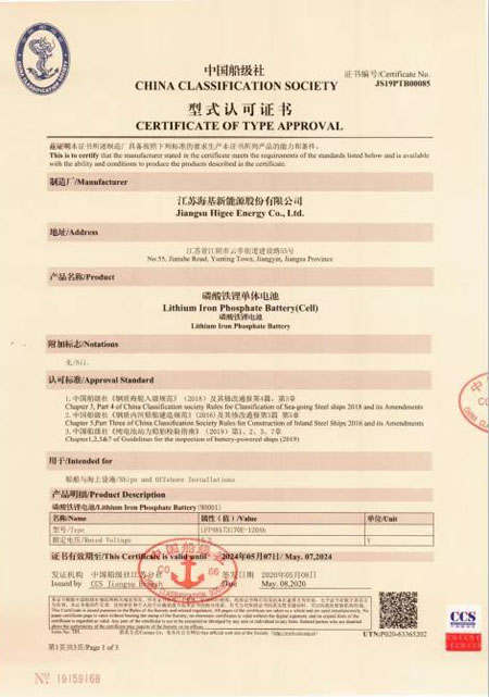 2020年5月,海基新能源磷酸鐵鋰電池產品通過中國船級社(CCS)最新檢測指南《GD22-2019 純電池動力船舶檢驗指南》認可和檢驗,該標準發布日期為2019年12月1日,相對舊標準《GD22-2015 純電池動力船舶檢驗指南》測試內容有顛覆性變更,增加了GB36276-2018《電子儲能用鋰離子電池》內容。自新標準變更實施以來,我司為首批獲得此認可證書的企業。